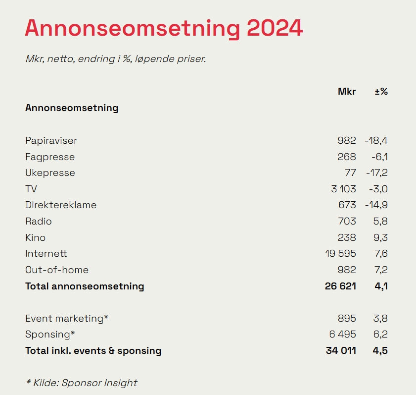 Hele den såkalte «Mediekaken 2024», som også inkluderer sponsing og arrangementer, viser de ulike medienes andel av det totale reklamemarkedet. Hele kaken utgjør totalt 34 011 millioner kroner og har økt med 4,5 prosent siden i fjor. De største kategoriene er søk (20,3 prosent), sponsing (19,1 prosent) og sosiale nettverk (15,2 prosent).