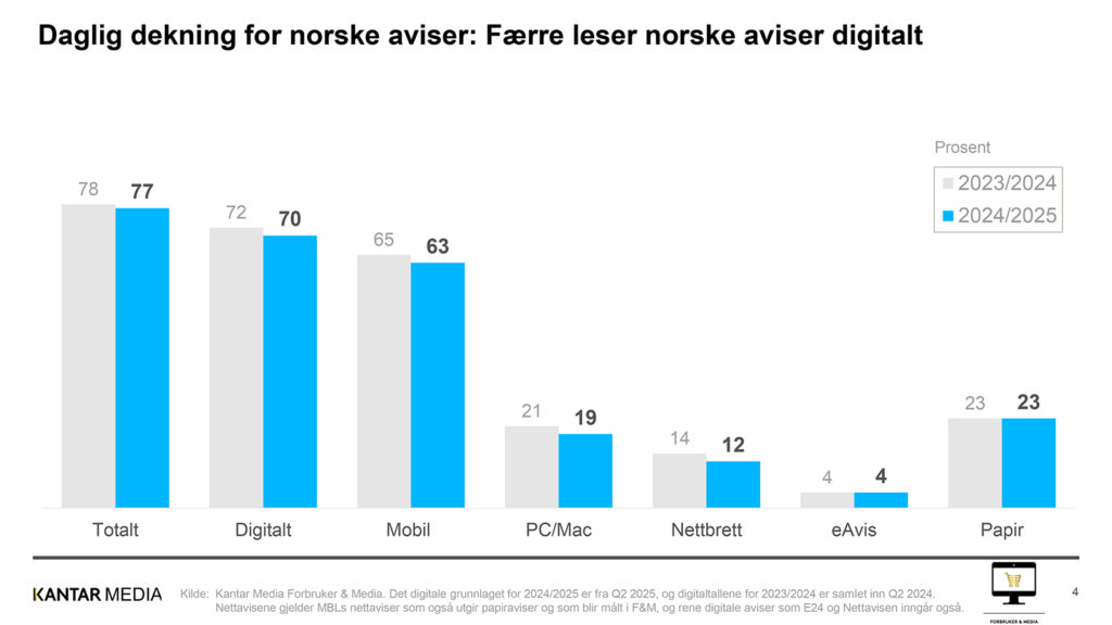 Det mest slående med resultatene er den sterke tilbakegangen for papiravisene. Totalt leser 77 prosent en avis daglig i måleperioden (2024/2025) – på papir eller digitalt. Men bare 23 prosent av de spurte leste daglig en papirvis.