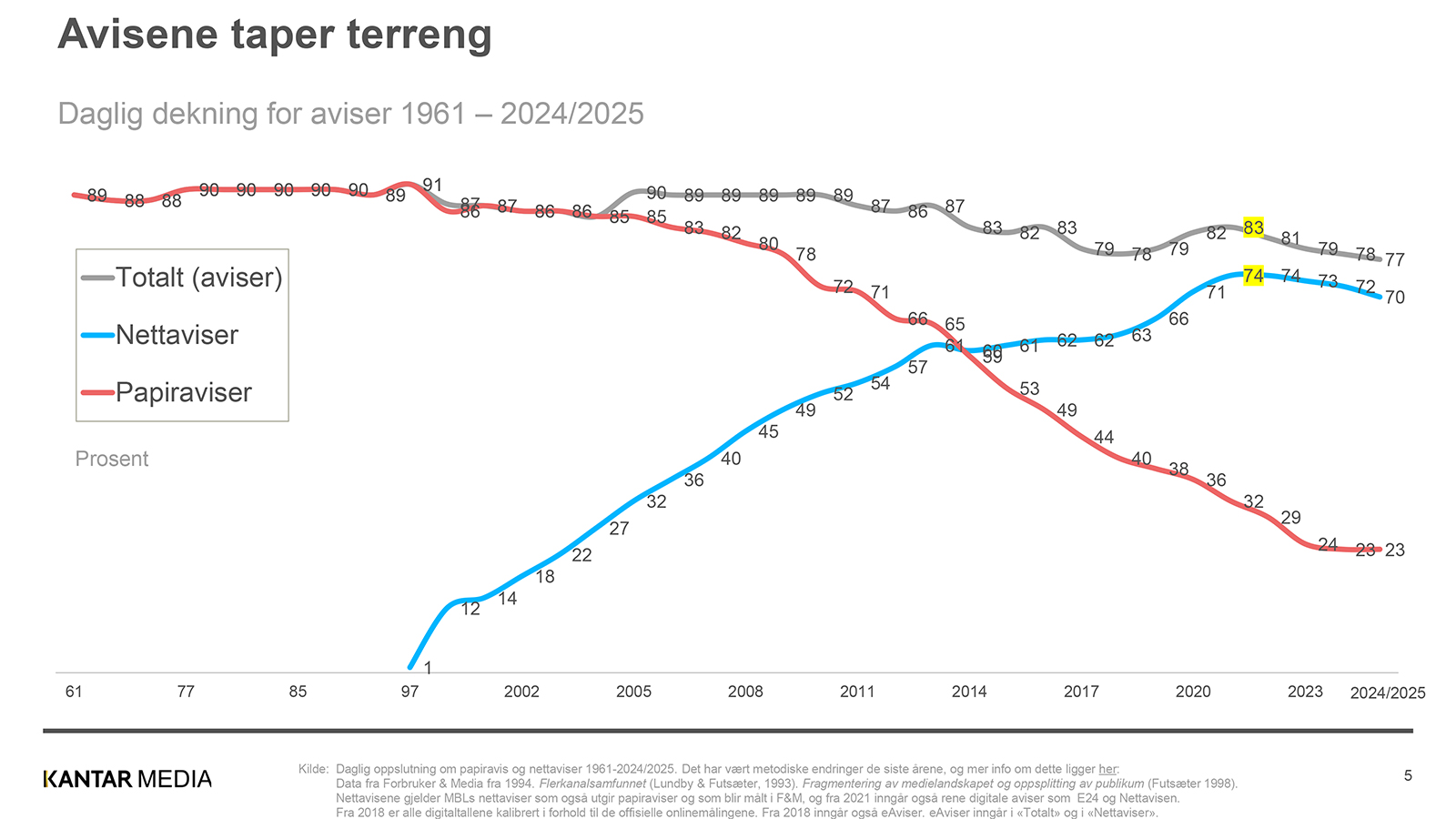 Hvis man ser på den historiske utviklingen, er trenden enda tydeligere. Fra 1961 til 2025 har det vært en nedgang fra 89 prosent til 77 prosent totalt sett. Fallet har vært enda større hvis man bare ser på papiraviser, fra 89 prosent til dagens 23 prosent.