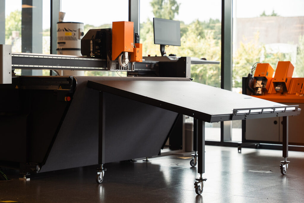 På den andre siden av skjærebordet er avlastningsbordet, som har stopp som holder det ferdige materialet på plass.
