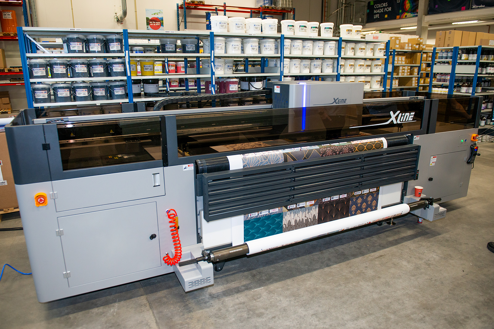 Den har fargestasjoner for CMYK, hvit, lakk, lys cyan og lys magenta. Standardkonfigurasjonen er tre skrivehoder. Maskinen i Marabus showroom har tolv skrivehoder: åtte for CMYK, to for hvitt blekk og to for lakk.